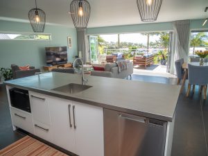 The villa is oriented north-west to make the most of the views, with wrap-around veranda-style decking offering multiple options for relaxing and entertaining outdoors. The interior is wonderfully light and spacious with an extra-high stud height, two semi-separate lounges, a generous kitchen and adjacent dining area, and multiple sliding doors opening to the decks and garden views. An enclosed deck at the eastern end offers sheltered space you’ll be able to enjoy year-round as well as easy access to the separate office / studio space and a private rear courtyard.