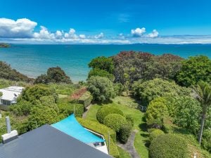 Immaculately presented and very well-maintained, this home offers light and spacious open plan living opening out to a sunny front deck and views of palms and Pohutukawa trees, and sea views from the kitchen and living spaces. Main living and the master suite are elevated on the upper level with two more bedrooms, a bathroom, and an internal access double garage below. The privately positioned master suite includes a walk-in wardrobe and easy access to the main bathroom/ semi ensuite. The second bedroom downstairs features bifold doors opening out to a north facing covered courtyard sheltered by palm trees and architectural plantings.