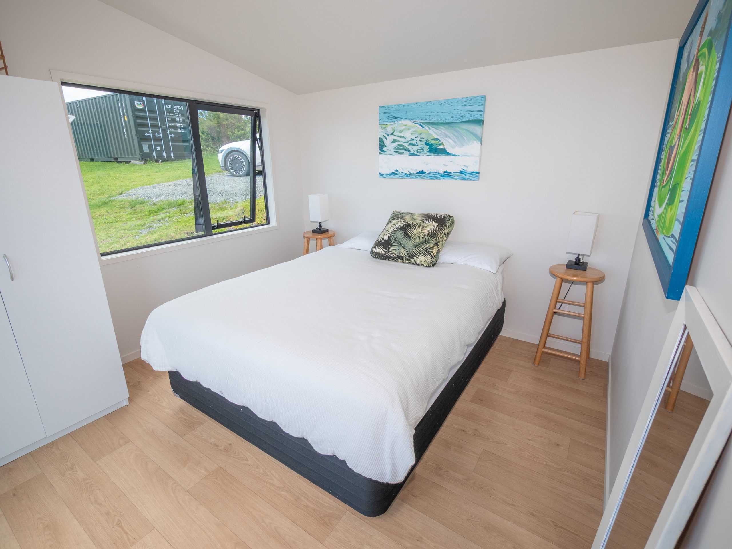 The interior features open-plan living bathed in natural light, with warm-toned timber benchtops and easy-care wood-look flooring balanced against crisp white walls and minimalist design. The bedroom is discreetly positioned at the eastern end, capturing morning sunshine and superb views, with sliding door access to the front deck. A stylish bathroom with tastefully integrated laundry facilities is tucked beside the bedroom.