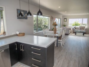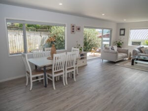 Main living is light filled, open plan, and spacious, oriented north-west with a stacking slider door off the lounge leading out to a sunny garden deck. There is an easy flow between kitchen, dining, and lounging areas, and newly installed wood look flooring adds warmth and functionality. The kitchen is sleek and modern with high quality cabinetry, generous bench space, and lovely garden views. The layout and design create an inviting space that is ideal for relaxed family living and entertaining friends.