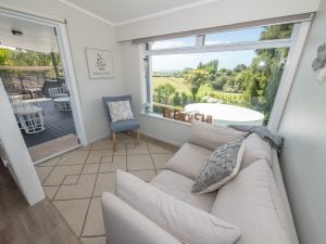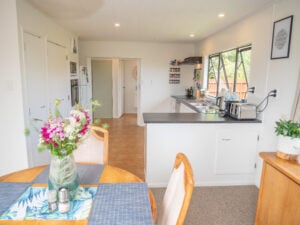 Completed in 2022 the decor is fresh and modern with open plan living blending out to a sunny seaward facing deck and a sheltered grassy patio. The efficient use of internal space provides for a comfortable lounge, full kitchen with a bathroom and laundry adjacent, and a good-sized double bedroom at the far end. The bedroom features superb views, sliding door access to the front deck and a good amount inbuilt storage. Double glazing throughout, heat pumps in the living area and bedroom, plus insect screens, make it easy to keep indoor living comfortable year-round.