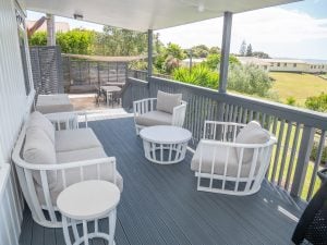 Surrounding grounds blend easy-care coastal plantings with raised vegetable garden beds, well-formed concrete pathways, and privacy fencing. The front deck steps down to the gardens with a nicely sheltered area at the western end being the perfect spot for a spa or second outdoor dining area.