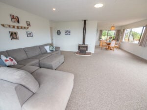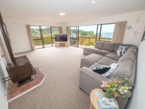 This warm and inviting 3 bedroom /1.5 bathroom home is an easy walk from the beach and enjoys wide sea, bush, and coastal views. The home features sunny wrap-around decking, spacious open plan living, an internal access double garage, and a sheltered and private rear lawn.