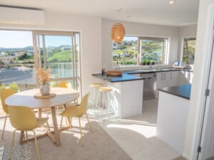 Two luxurious bedrooms are positioned either side of the living space with independent deck access and lovely sea views. The master on the western side also features a stylish ensuite bathroom and walk-in-wardrobe. A third double bedroom, main bathroom, and separate laundry with exterior access are tucked behind the main living area, and there is a cleverly positioned study that can be partitioned off from the lounge.
