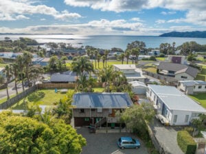 Located on the beach side of the highway this 3 bedroom/ 2 bathroom/ 2 living area home enjoys a tranquil tropical garden atmosphere with lovely views over Doubtless Bay, and the added bonus of being an easy 200m walk to the local shopping centre and a 300m stroll from the golden sands of Coopers Beach.
